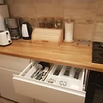 A fully furnished kitchen is featured with a fridge, an oven, and kitchenware, as well as coffee and tea makers, ensuring a better dining experience. Kasprzaka - Legionow bus stop is in the vicinity of this property.